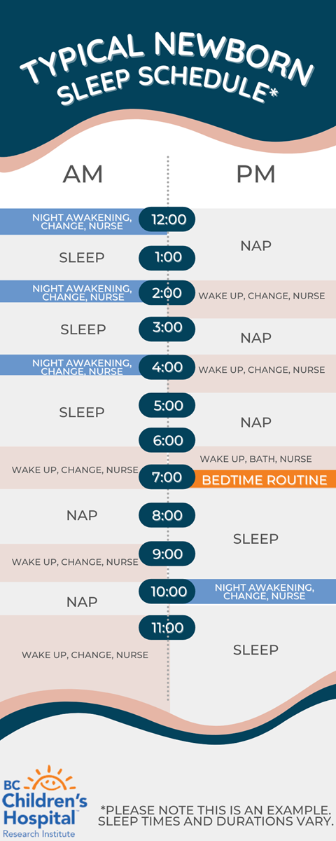 On average, newborns sleep for around 16-17 hours of the day. This usually consists of three daytime naps on average, as well as several bouts of sleep during the night. It is normal for newborns to awaken at several times during the night, as their sleep cycle is not solely taking place at night. On average, newborns will awaken 2-3 times per night, and these awakenings last roughly 45-90mins each.